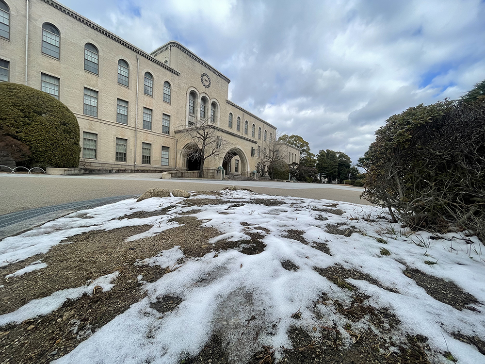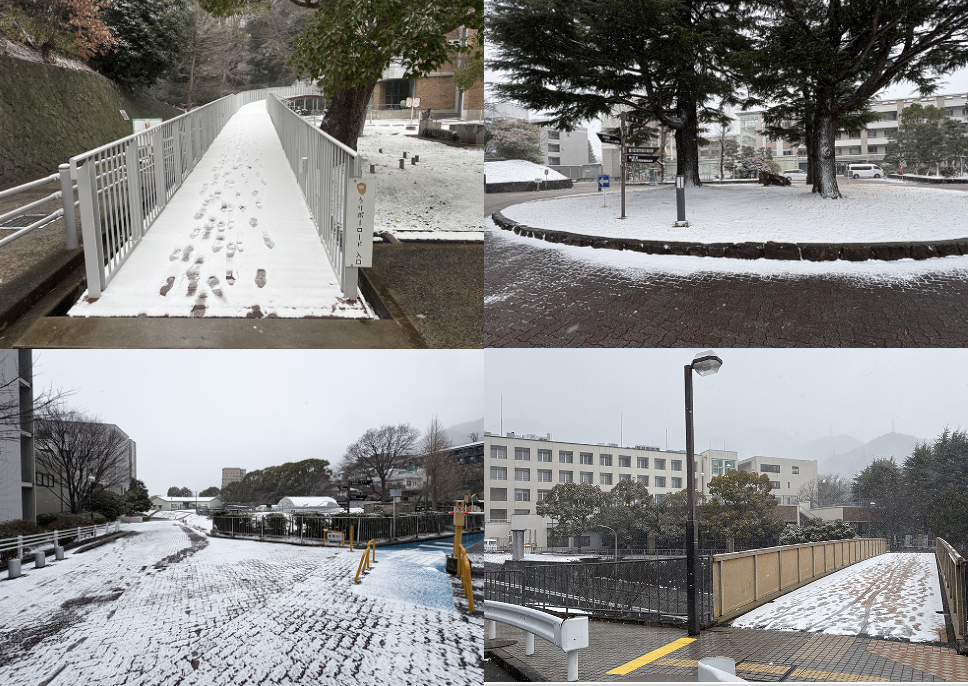 (写真:学内もうっすら雪化粧。左上=うりぼーロード、上右=文学部前ロータリー、左下=六甲台第2キャンパス、下右=鶴甲第1キャンパスの陸橋で 2026年2月8日午後 撮影:篠原大晴)