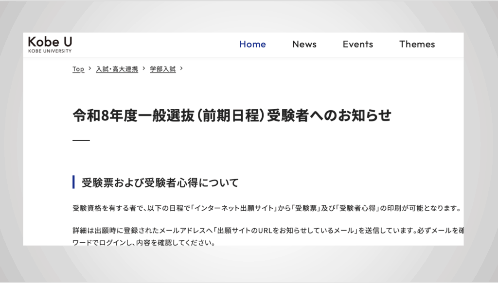 神戸大サイト「令和8年度一般選抜(前期日程)受験者へのお知らせ」