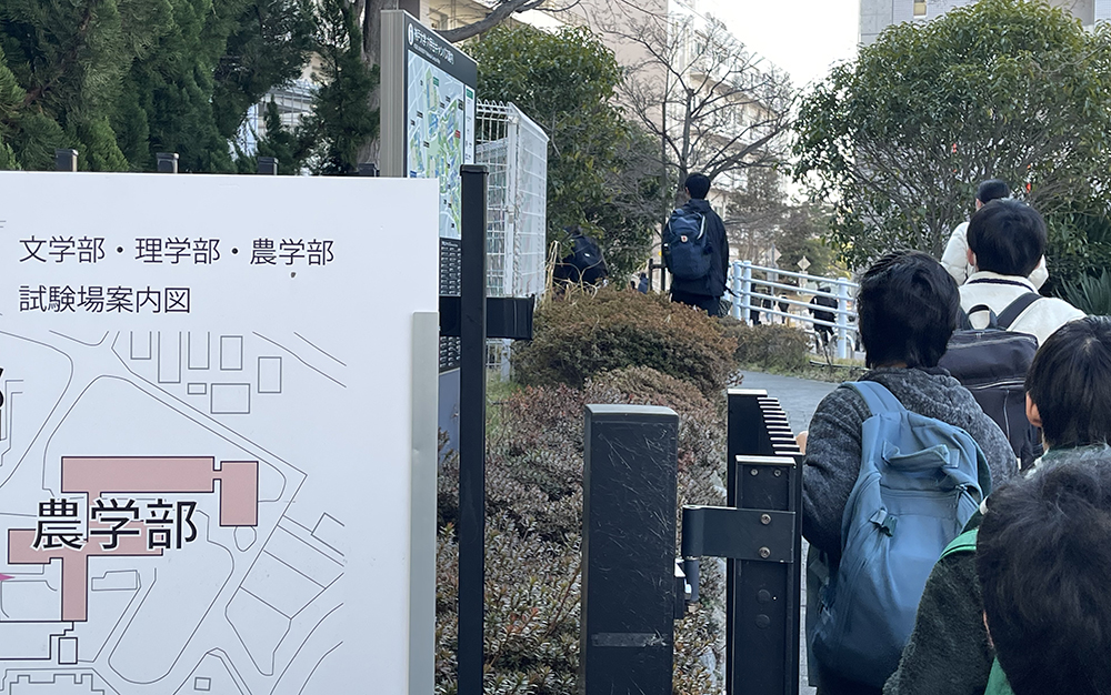 (写真:文理農学部の門から試験場に向かう受験生 2026年3月12日 14時18分)