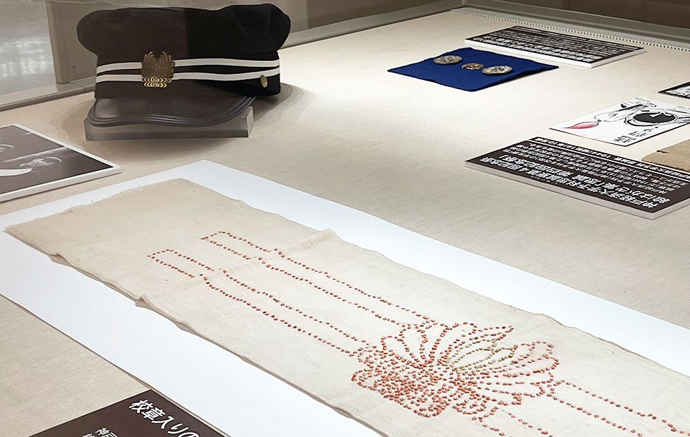 (写真下:大学の校章を形どった千人針=手前)