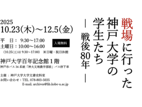 神戸大学史・特別展「戦場に行った神戸大学の学生たち-戦後80年-」が10月23日(木)から12月5日(金)まで百年記念館1階展示ホールで行われている。学徒出陣で戦地に赴いた神戸大の学生たちにまつわる記録や資料が展示さ…