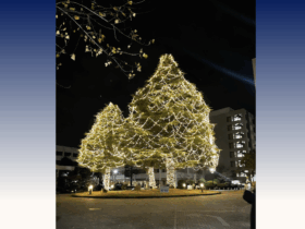 六甲台第2キャンパスの文学部前ロータリーにある3本のヒマラヤスギ。この枝や幹に、2万灯のあたたかな電球色を中心としたLEDのイルミネーションが灯されて、巨大なクリスマスツリーが出現している。<編集部>